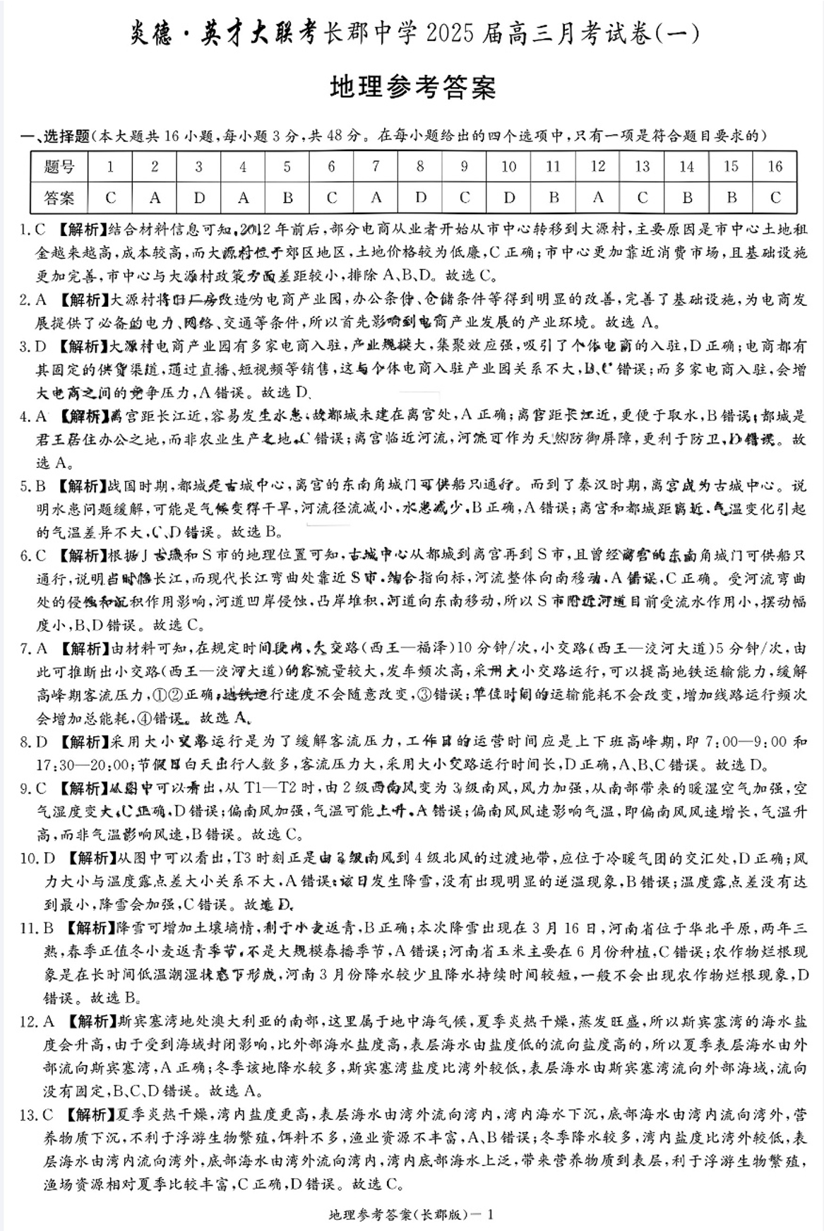 湖南省长郡中学2025届高三年级月考试卷(一)地理答案