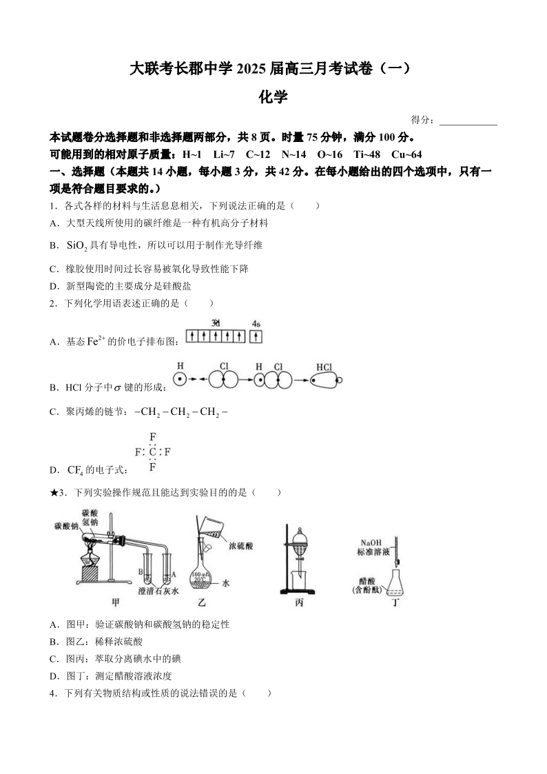 湖南省长郡中学2025届高三年级月考试卷(一)化学