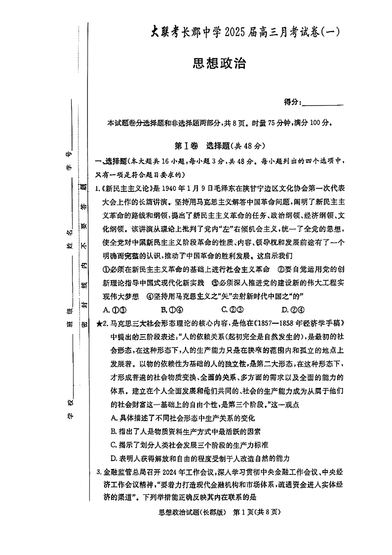 湖南省长郡中学2025届高三年级月考试卷(一)政治