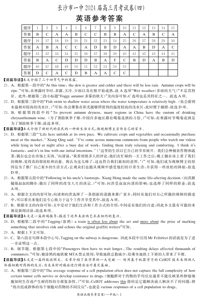 湖南省长沙市第一中学2023-2024学年高三上学期月考卷(四)英语答案