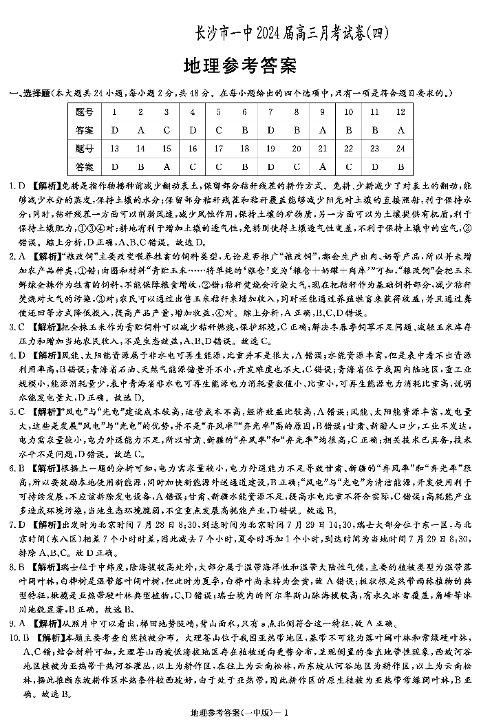 湖南省长沙市第一中学2023-2024学年高三上学期月考卷(四)地理答案