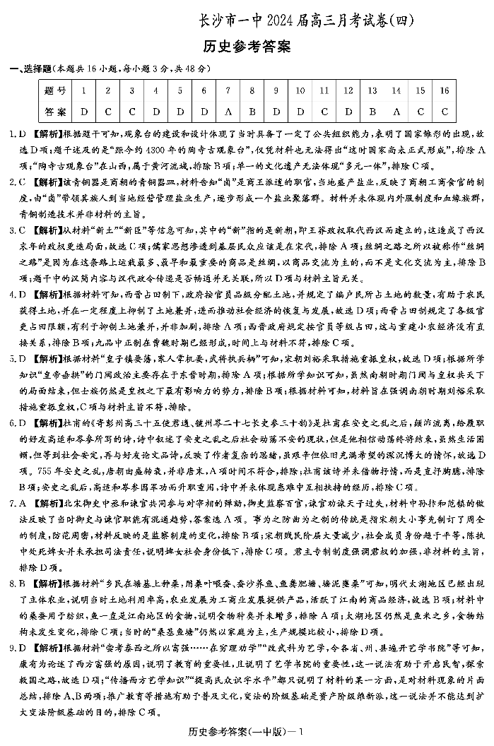 湖南省长沙市第一中学2023-2024学年高三上学期月考卷(四)历史答案