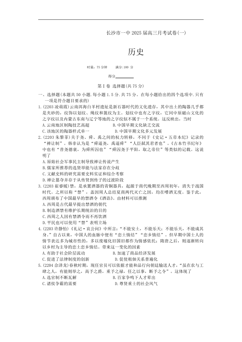 湖南省长沙市第一中学2025届高三上学期月考卷(一)历史