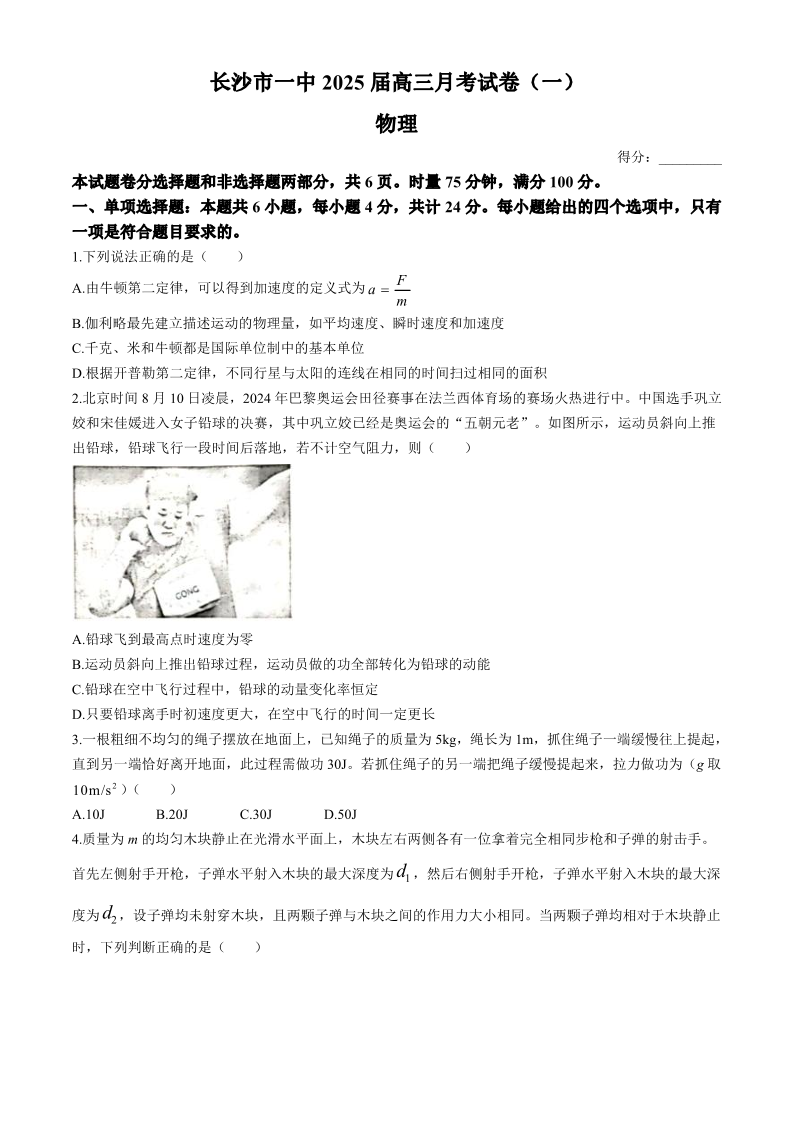 湖南省长沙市第一中学2025届高三上学期月考卷(一)物理