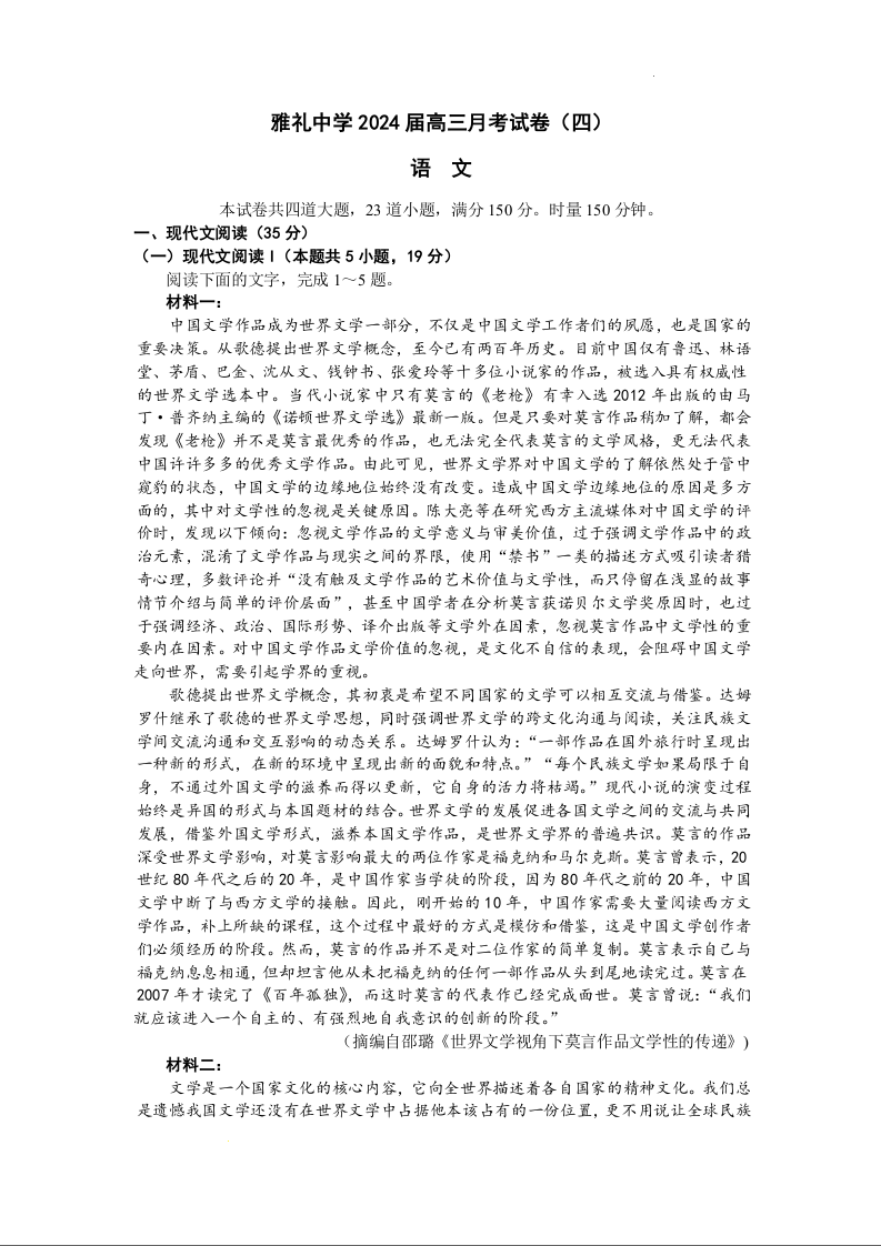 湖南省长沙市雅礼中学2023-2024学年高三上学期月考试卷(四)语文