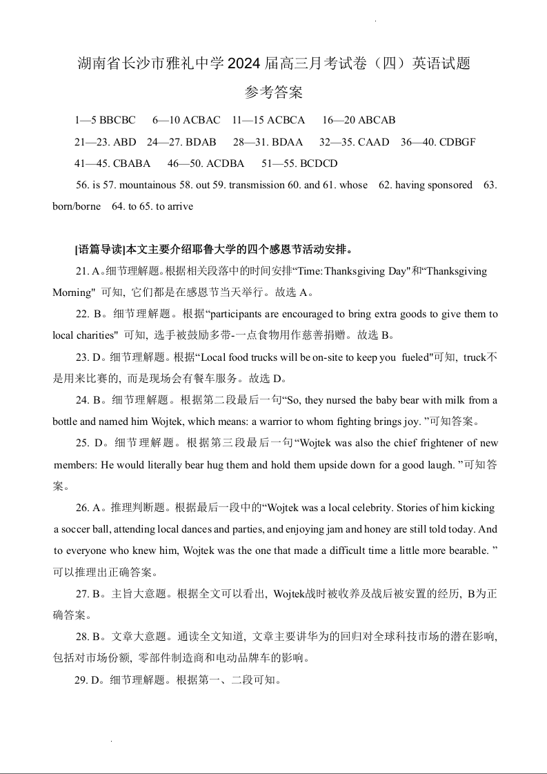 湖南省长沙市雅礼中学2023-2024学年高三上学期月考试卷(四)英语答案