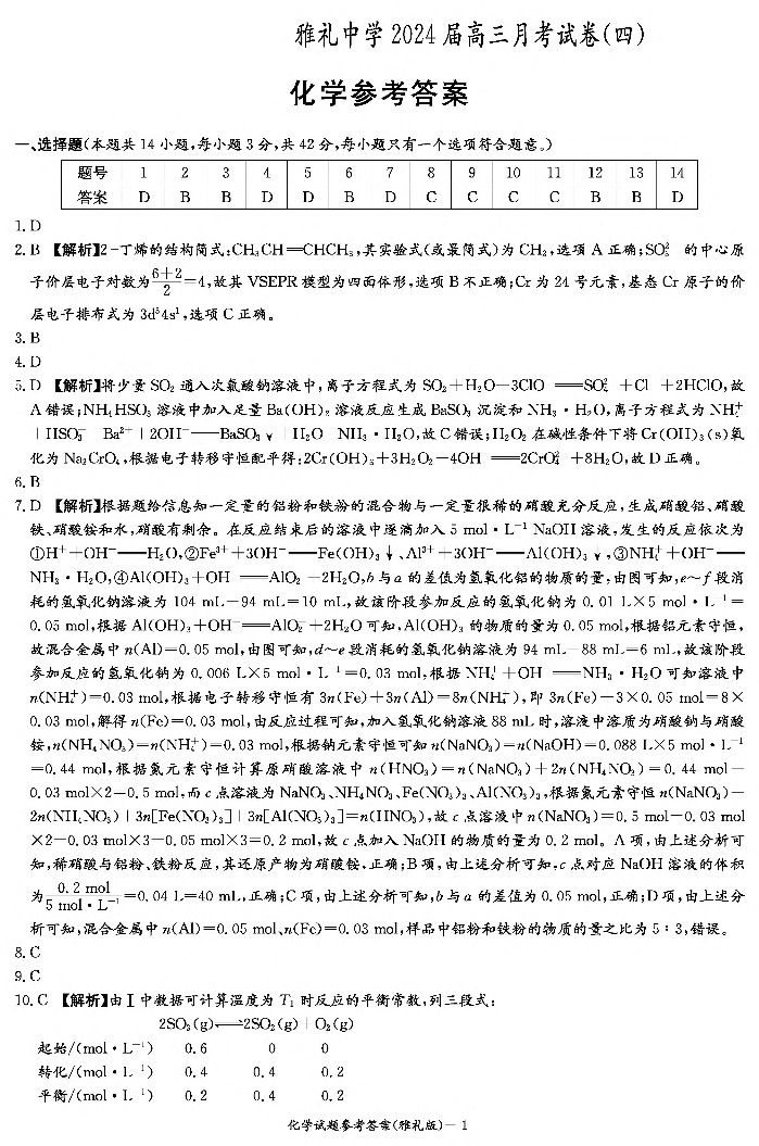 湖南省长沙市雅礼中学2023-2024学年高三上学期月考试卷(四)化学答案