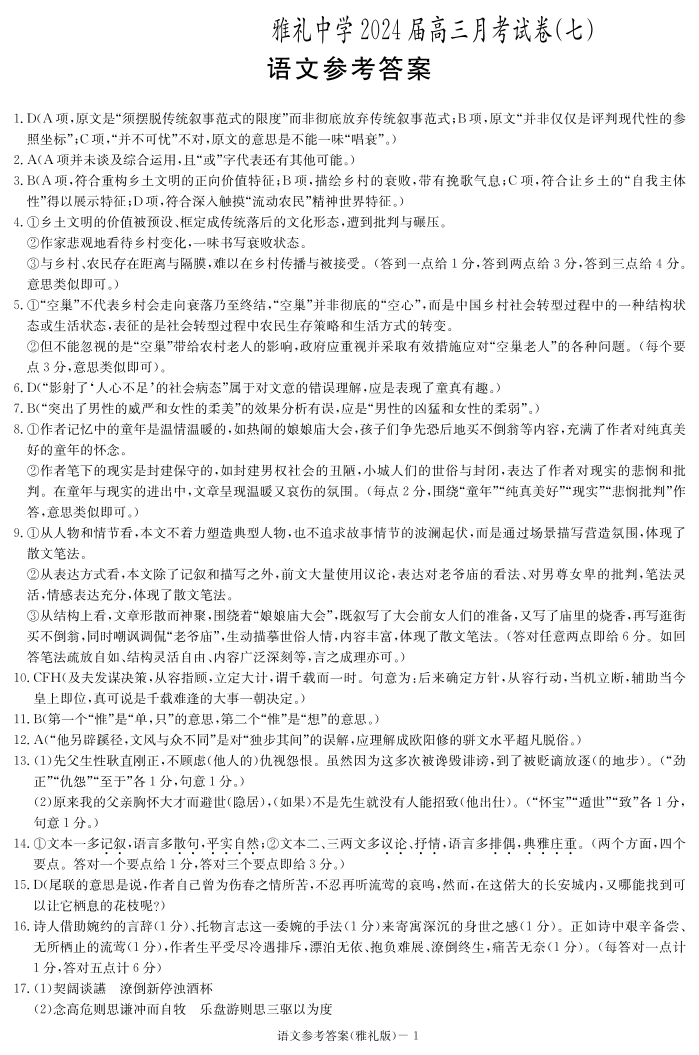 湖南省长沙市雅礼中学2023-2024学年高三下学期月考(七)语文答案