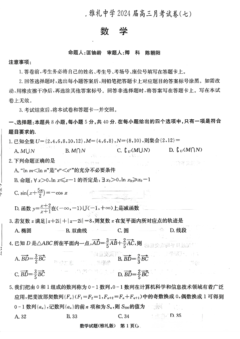 湖南省长沙市雅礼中学2023-2024学年高三下学期月考(七)数学