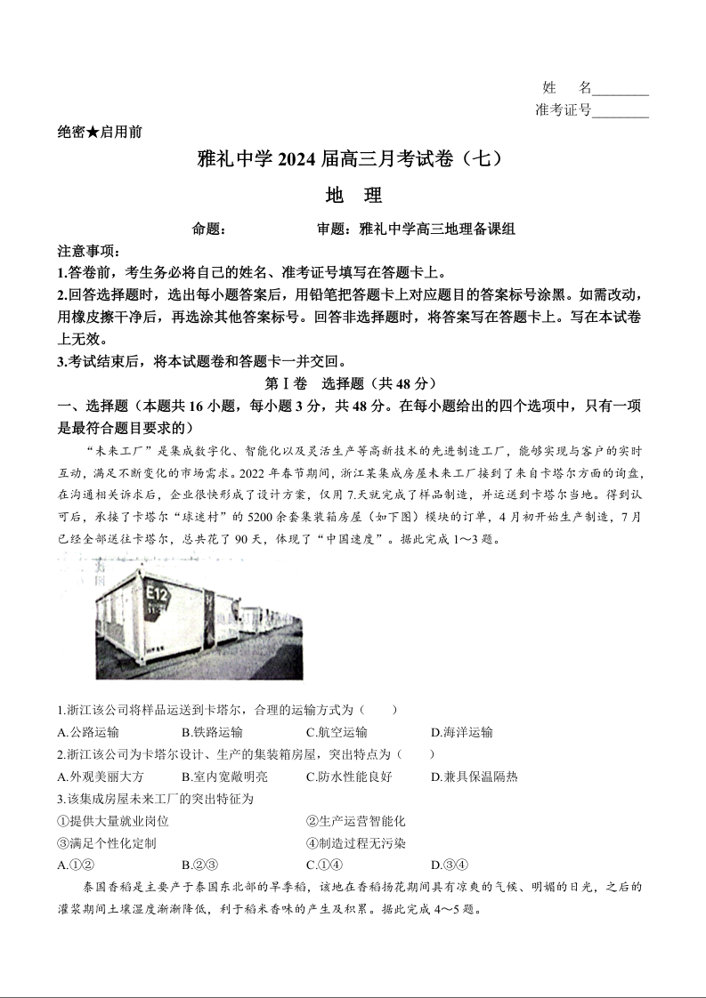 湖南省长沙市雅礼中学2023-2024学年高三下学期月考(七)地理