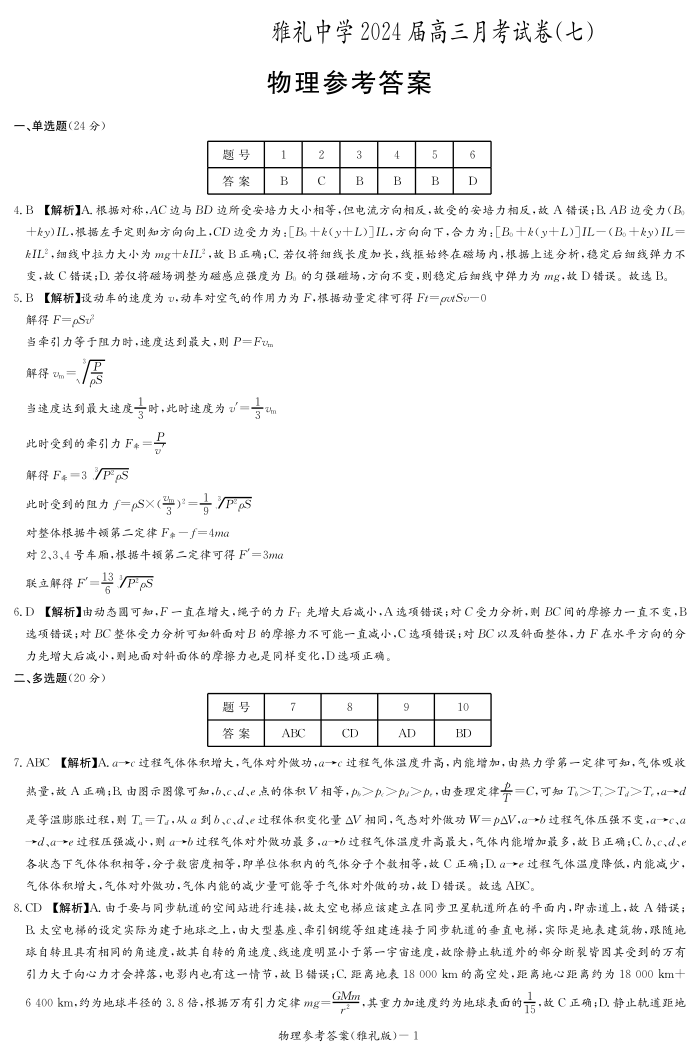 湖南省长沙市雅礼中学2023-2024学年高三下学期月考(七)物理答案