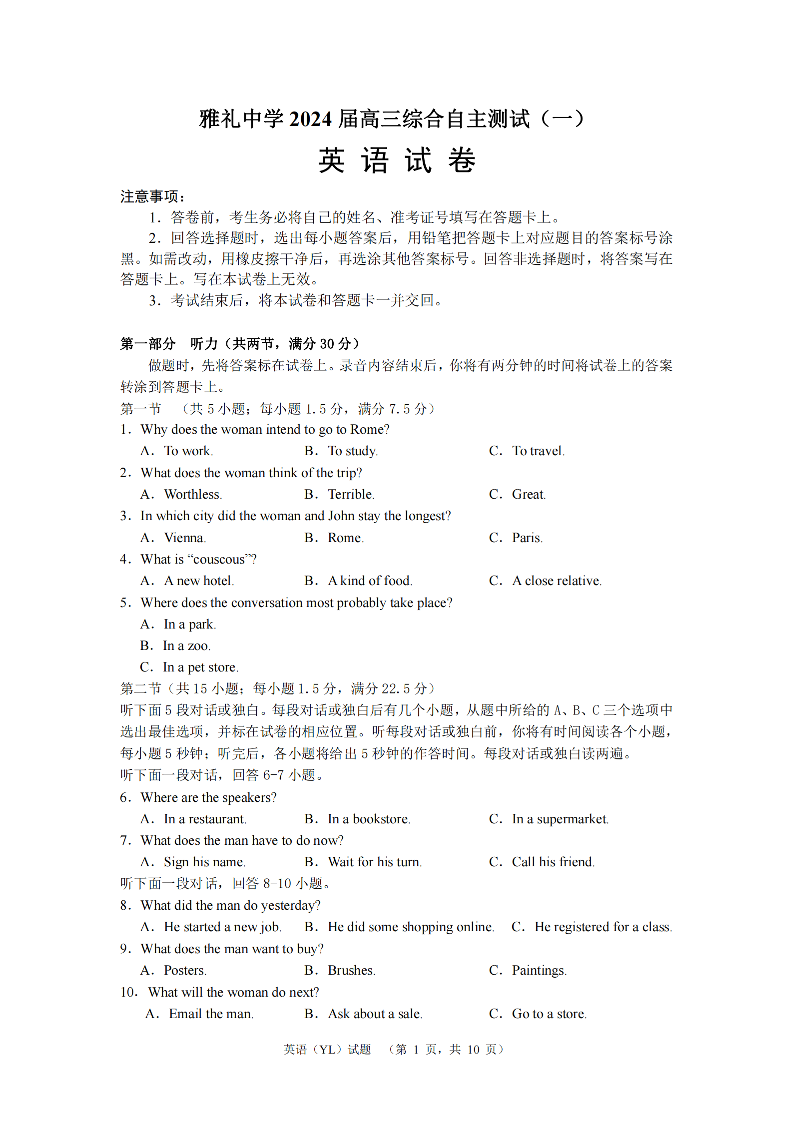 湖南省长沙市雅礼中学2024届高三下学期3月综合测试(一)英语