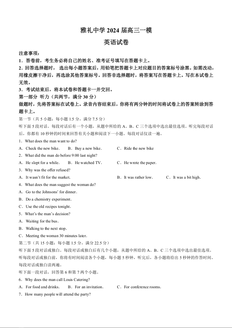 湖南省长沙市雅礼中学2024届高三一模 英语
