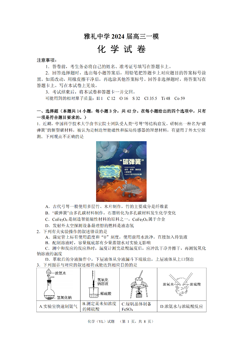 湖南省长沙市雅礼中学2024届高三一模 化学