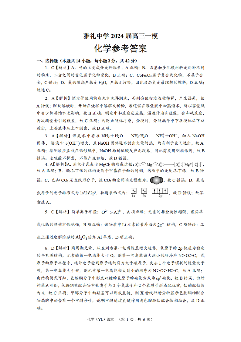 湖南省长沙市雅礼中学2024届高三一模 化学答案