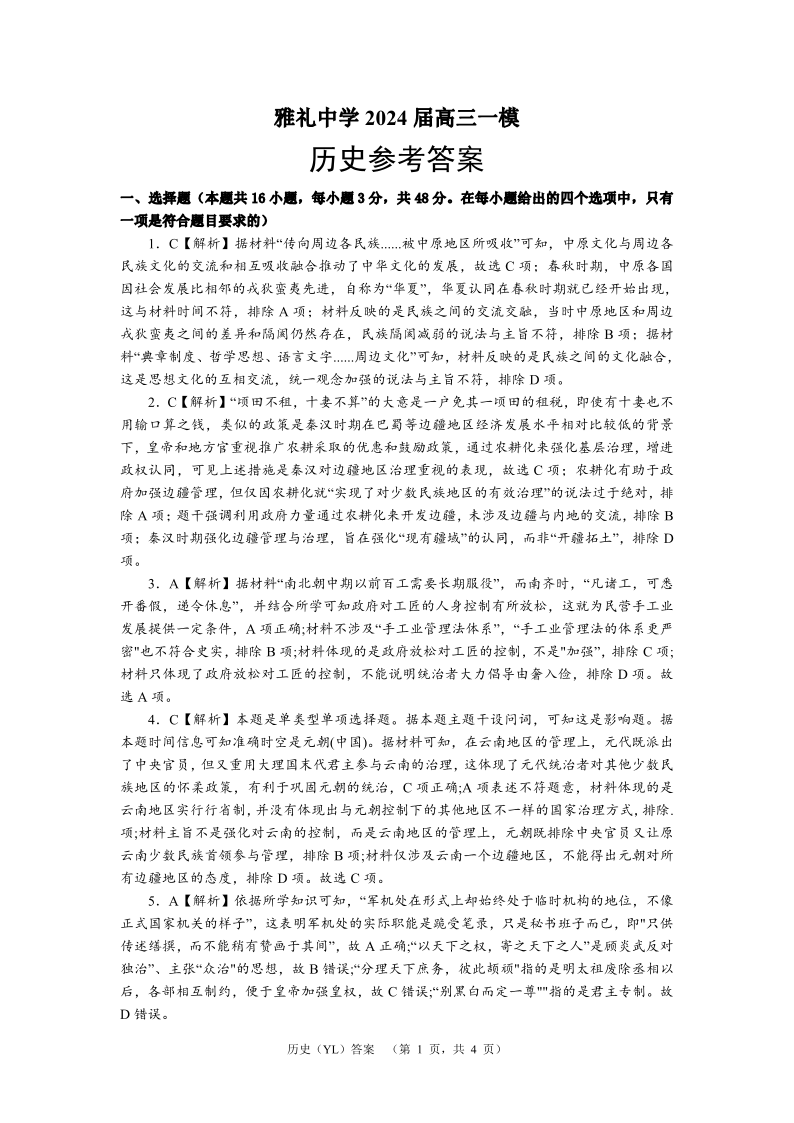 湖南省长沙市雅礼中学2024届高三一模 历史答案