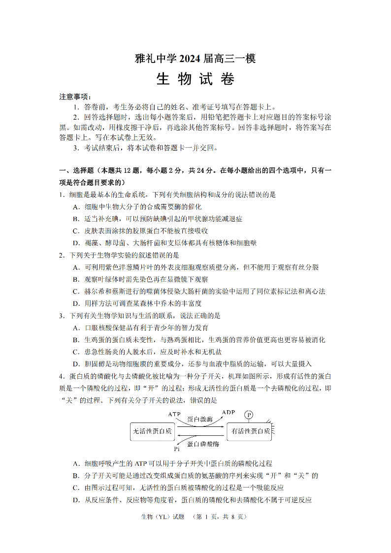 湖南省长沙市雅礼中学2024届高三一模 生物