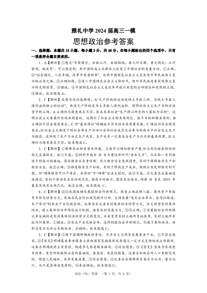 湖南省长沙市雅礼中学2024届高三一模 政治答案