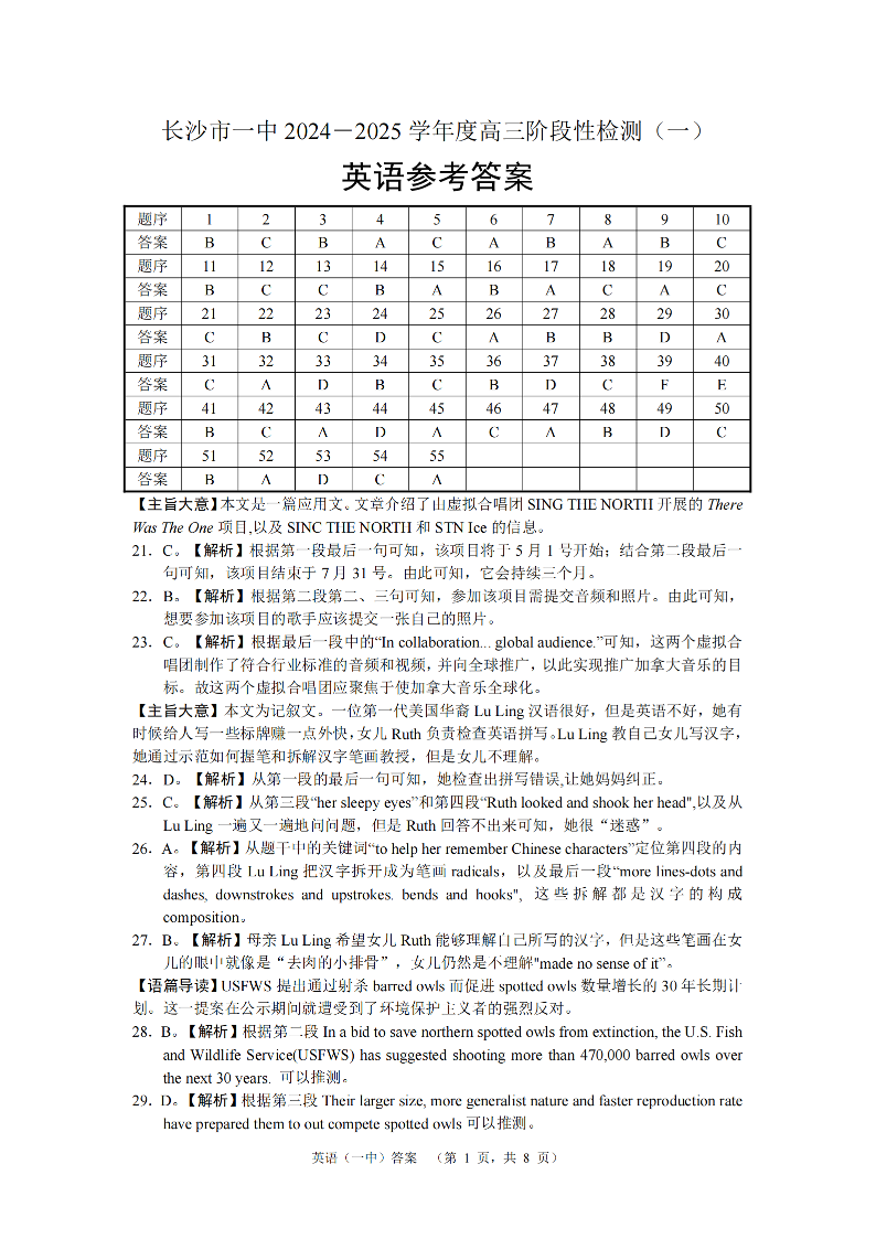 湖南省长沙市一中2024-2025学年高三阶段性检测(一)英语答案