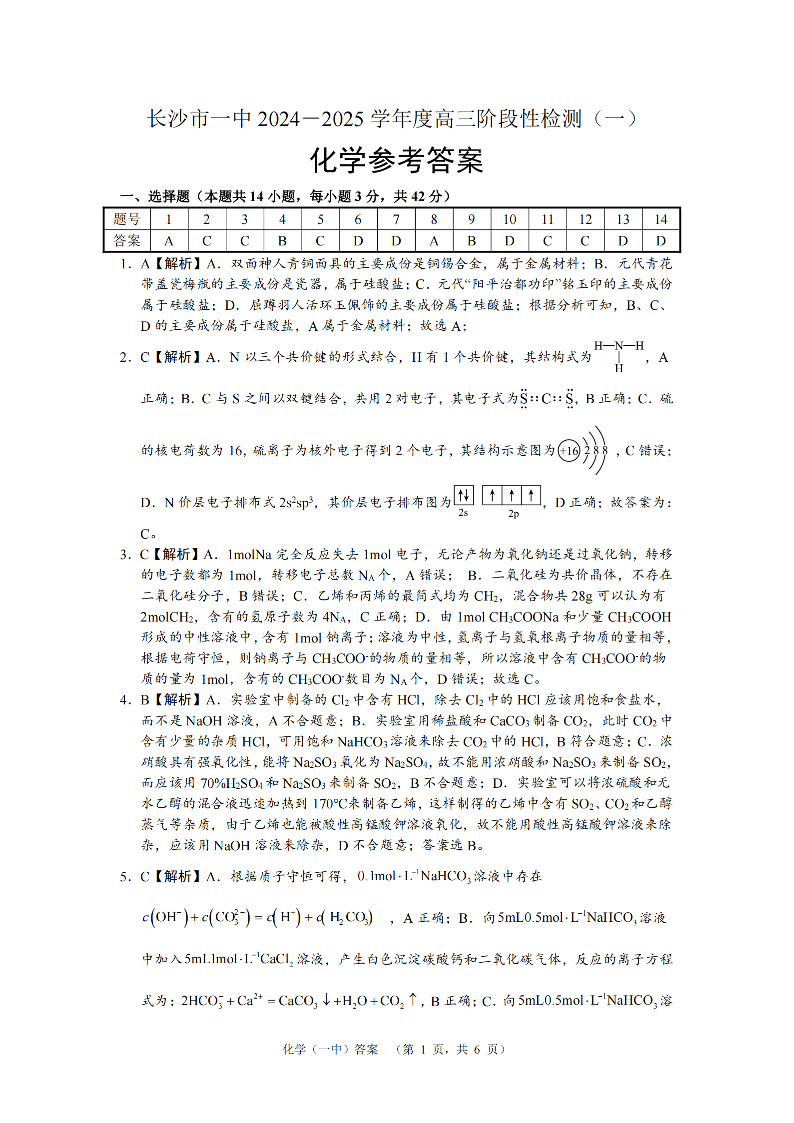 湖南省长沙市一中2024-2025学年高三阶段性检测(一)化学答案