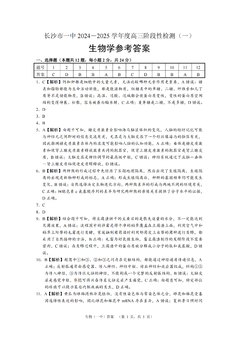 湖南省长沙市一中2024-2025学年高三阶段性检测(一)生物答案
