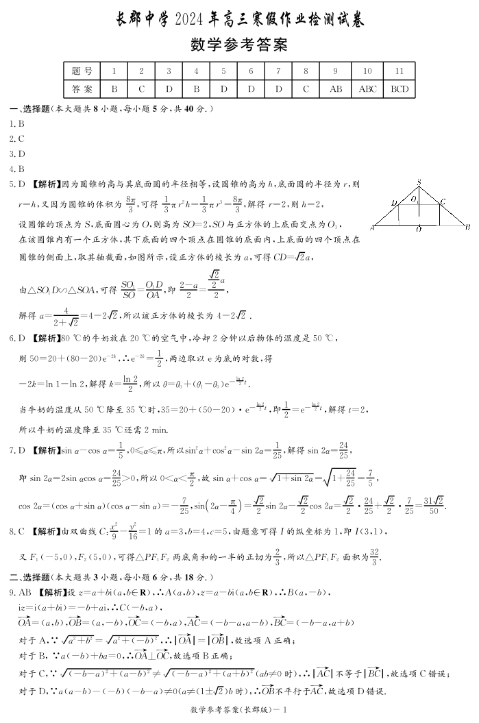 湖南省长沙市长郡中学2023-2024学年高三下学期寒假作业检测(月考六)数学答案