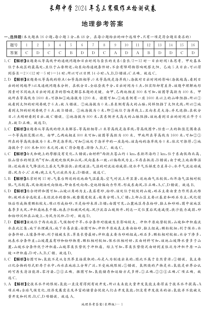 湖南省长沙市长郡中学2023-2024学年高三下学期寒假作业检测(月考六)地理答案