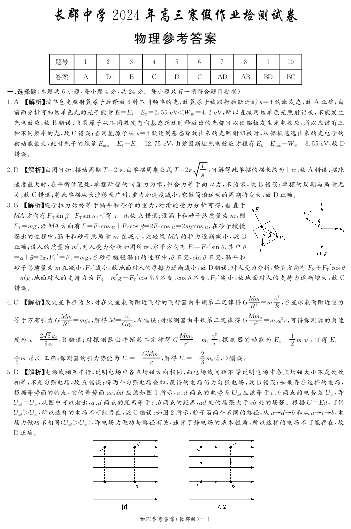 湖南省长沙市长郡中学2023-2024学年高三下学期寒假作业检测(月考六)物理答案