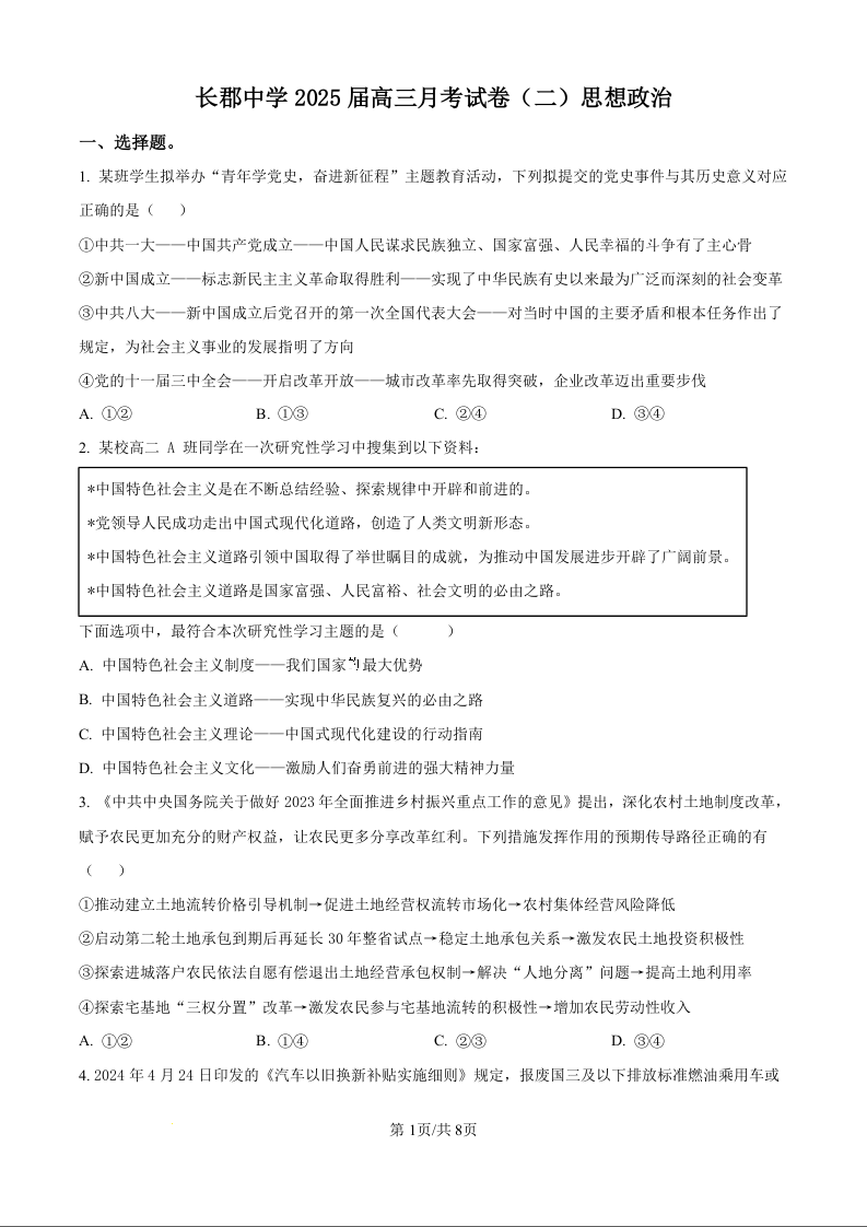 湖南省长沙市长郡中学2025届高三上学期月考(二)政治