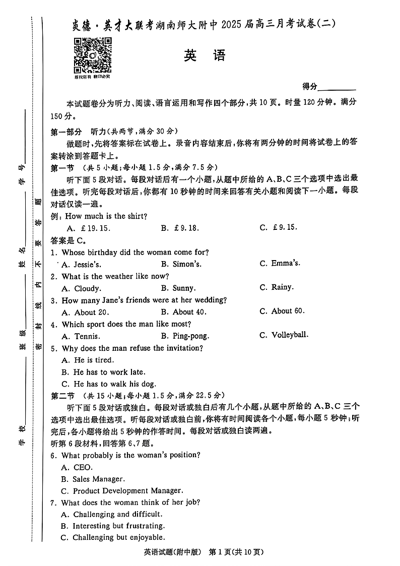 湖南师大附中2025届高三月考试卷(二)+英语