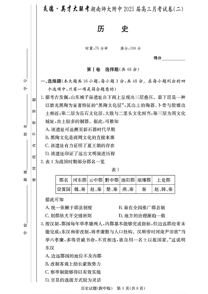 湖南师大附中2025届高三月考试卷(二)+历史