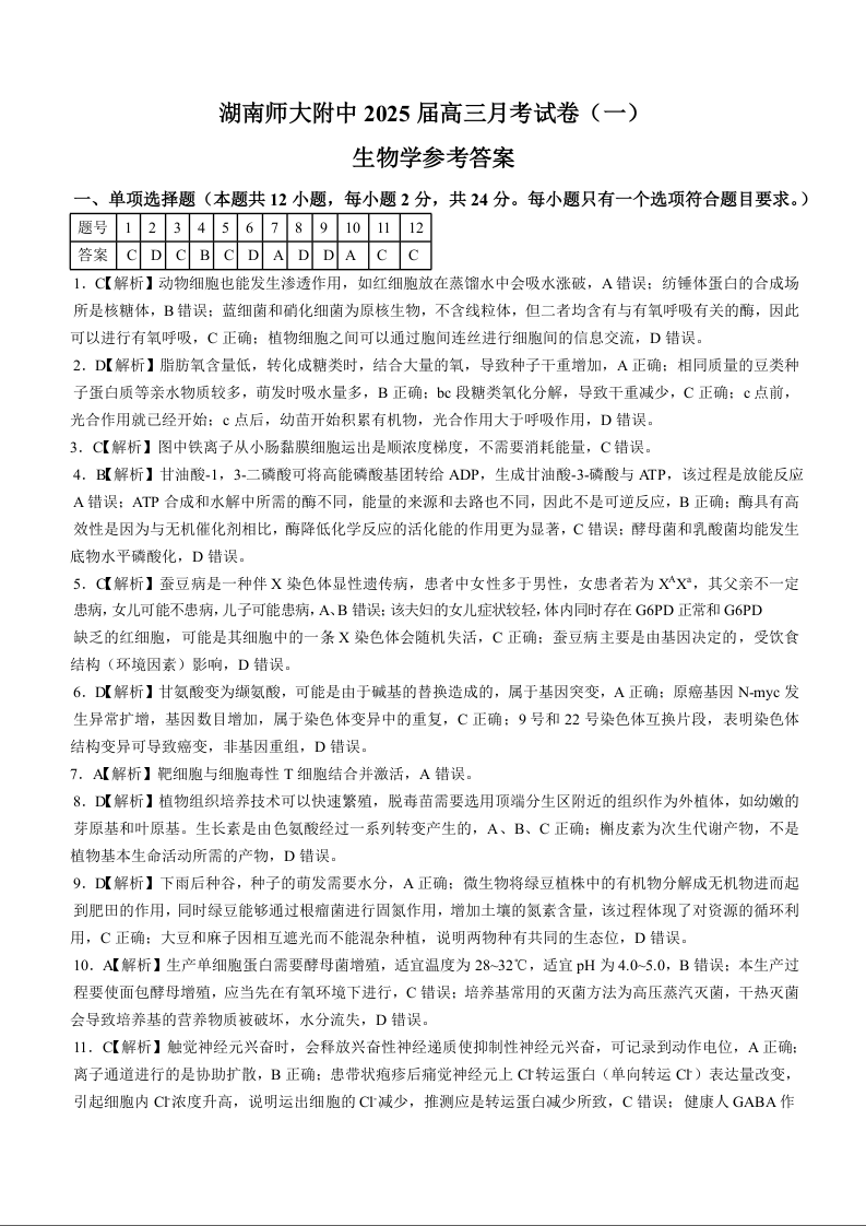 湖南师大附中2025届高三月考试卷(一)生物答案