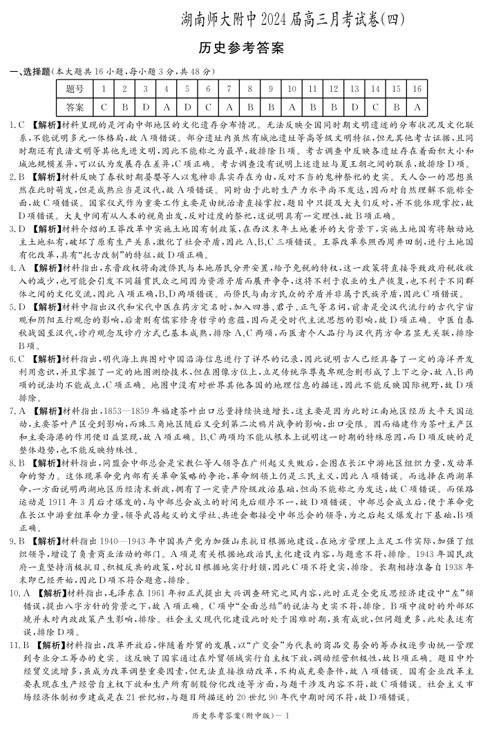 湖南师范大学附属中学2023-2024学年高三上学期月考卷(四)历史答案