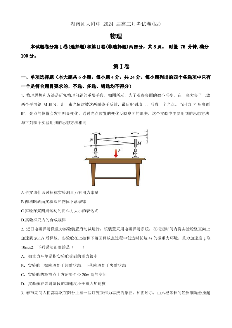 湖南师范大学附属中学2023-2024学年高三上学期月考卷(四)物理