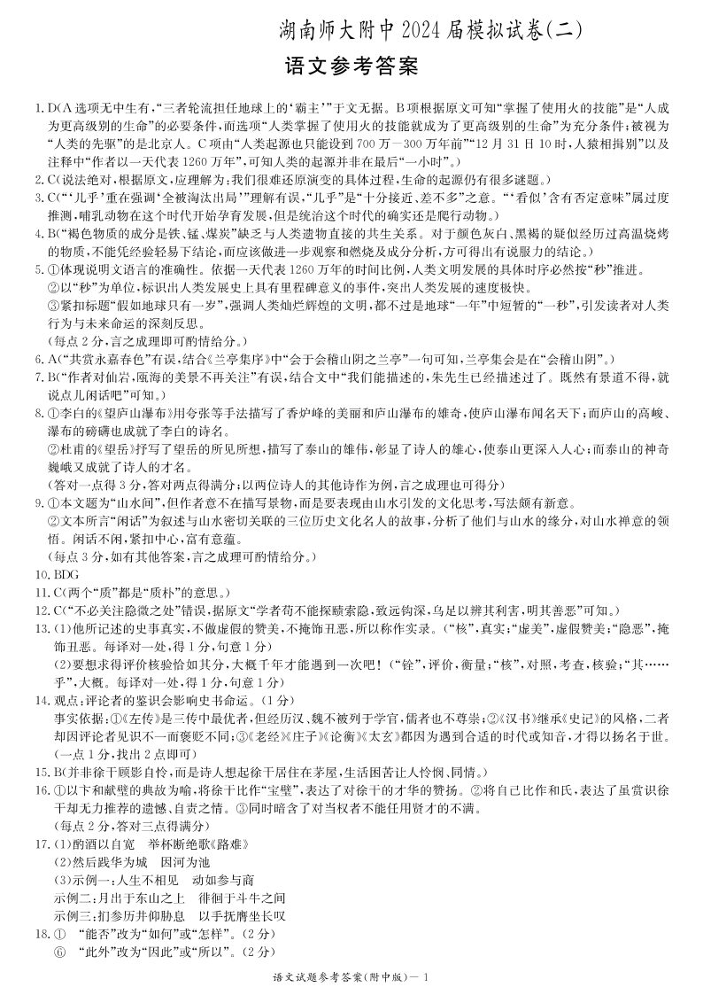 2024届湖南师范大学附属中学高三下学期模拟(二)语文答案