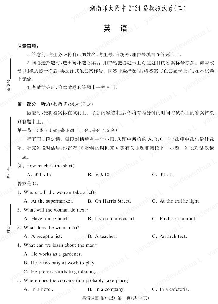 2024届湖南师范大学附属中学高三下学期模拟(二)英语