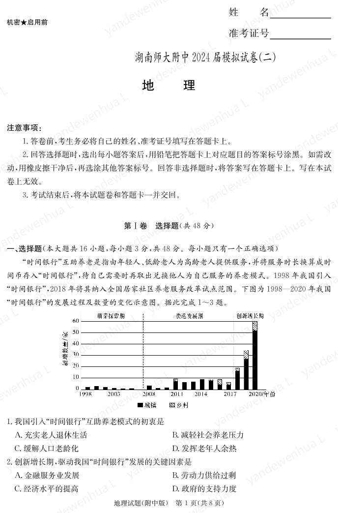 2024届湖南师范大学附属中学高三下学期模拟(二)地理