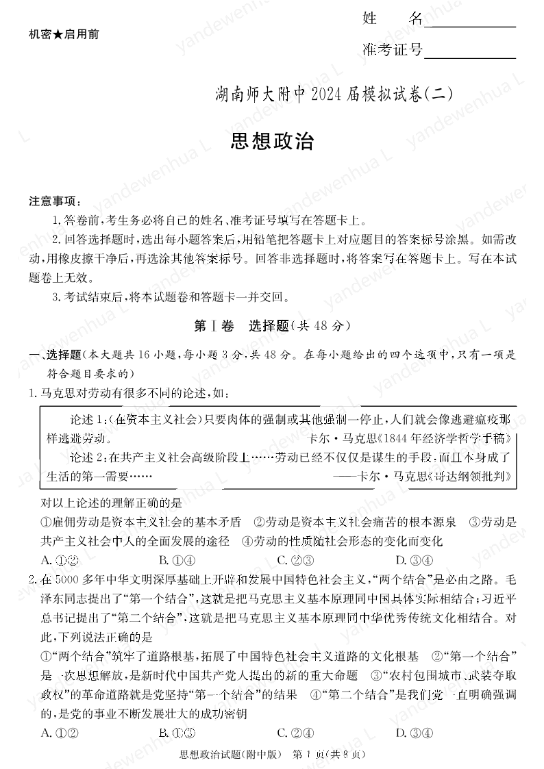 2024届湖南师范大学附属中学高三下学期模拟(二)政治