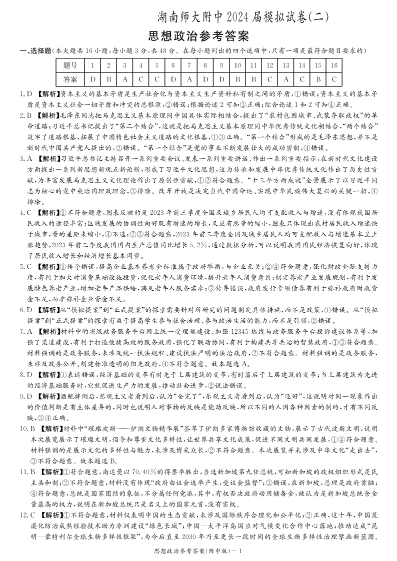 2024届湖南师范大学附属中学高三下学期模拟(二)政治答案