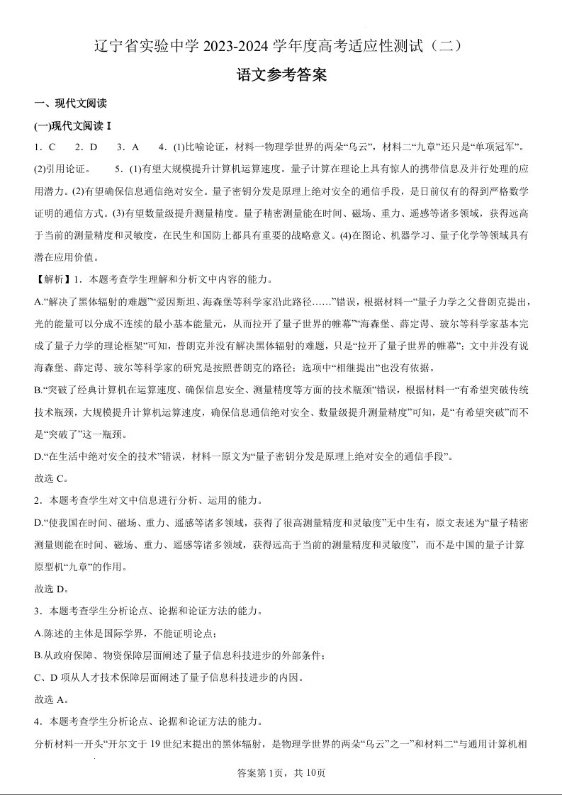 辽宁省实验中学2023-2024学年度高考适应性测试(二)语文参考答案