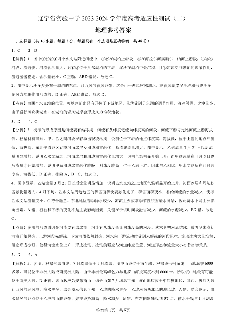 辽宁省实验中学2023-2024学年度高考适应性测试(二)地理参考答案