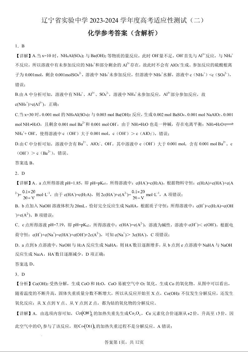 辽宁省实验中学2023-2024学年度高考适应性测试(二)化学参考答案