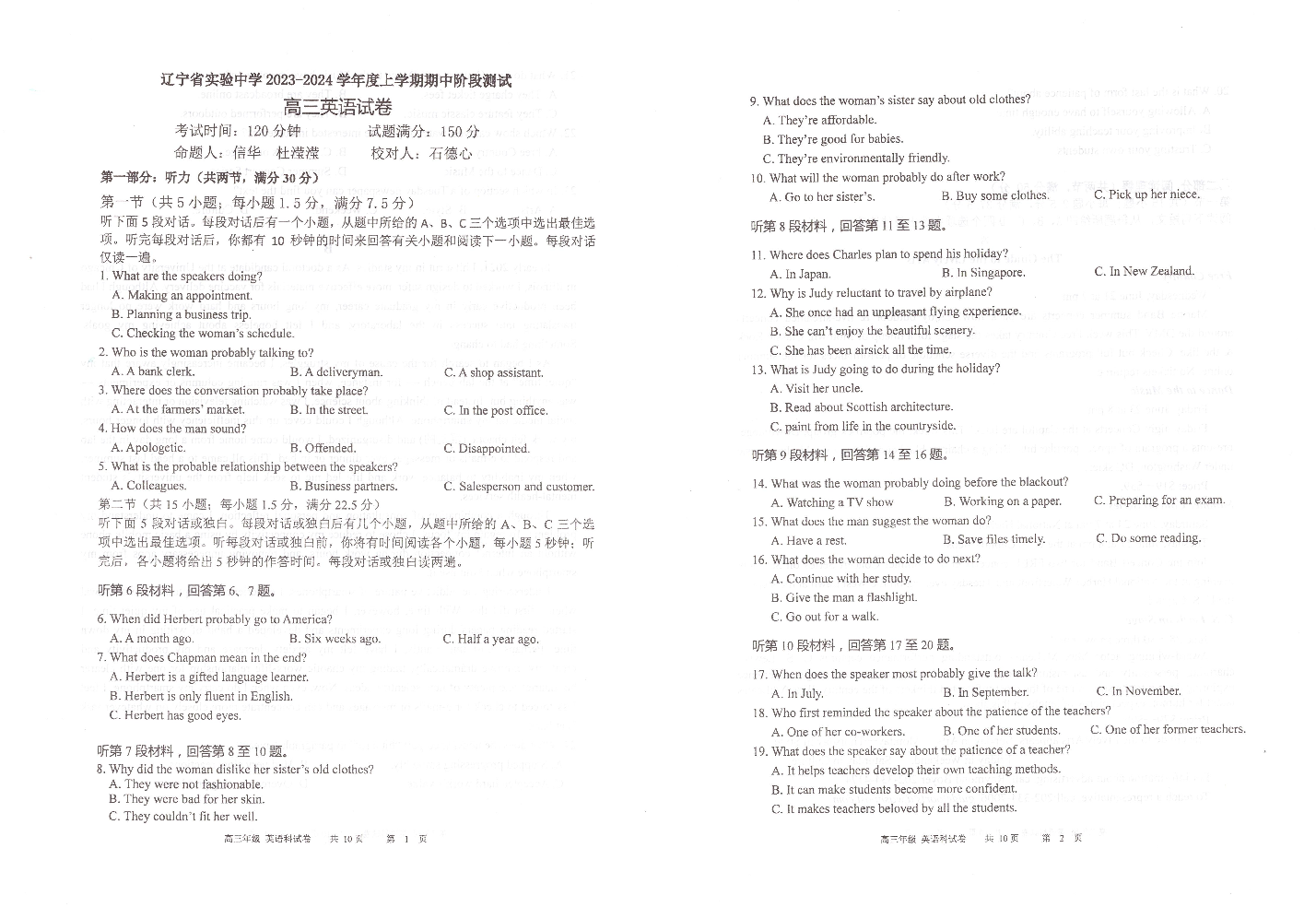 辽宁省实验中学2023-2024学年高三上学期期中考试 英语