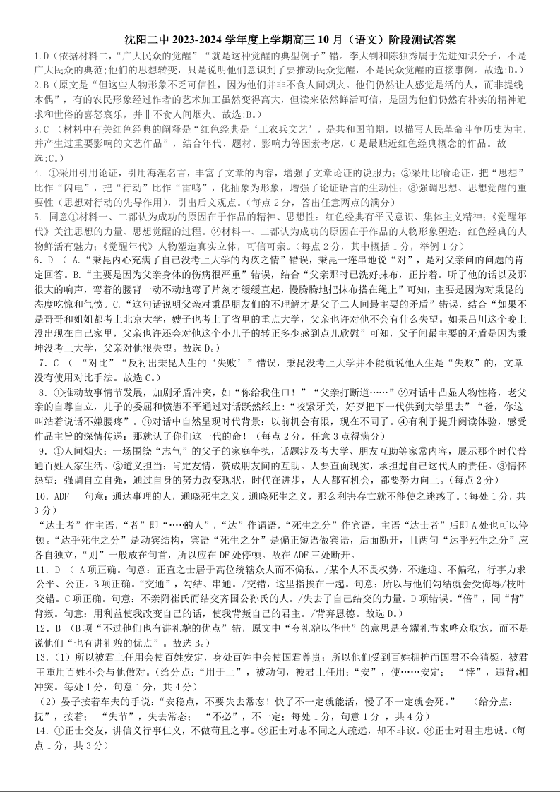 辽宁省沈阳市第二中学2023-2024学年高三上学期10月阶段测试 语文答案
