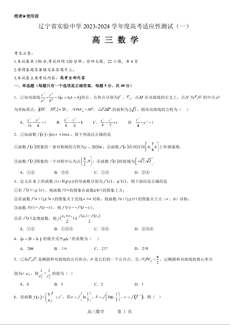 辽宁省实验中学2023-2024学年高三上学期高考适应性测试(一)数学