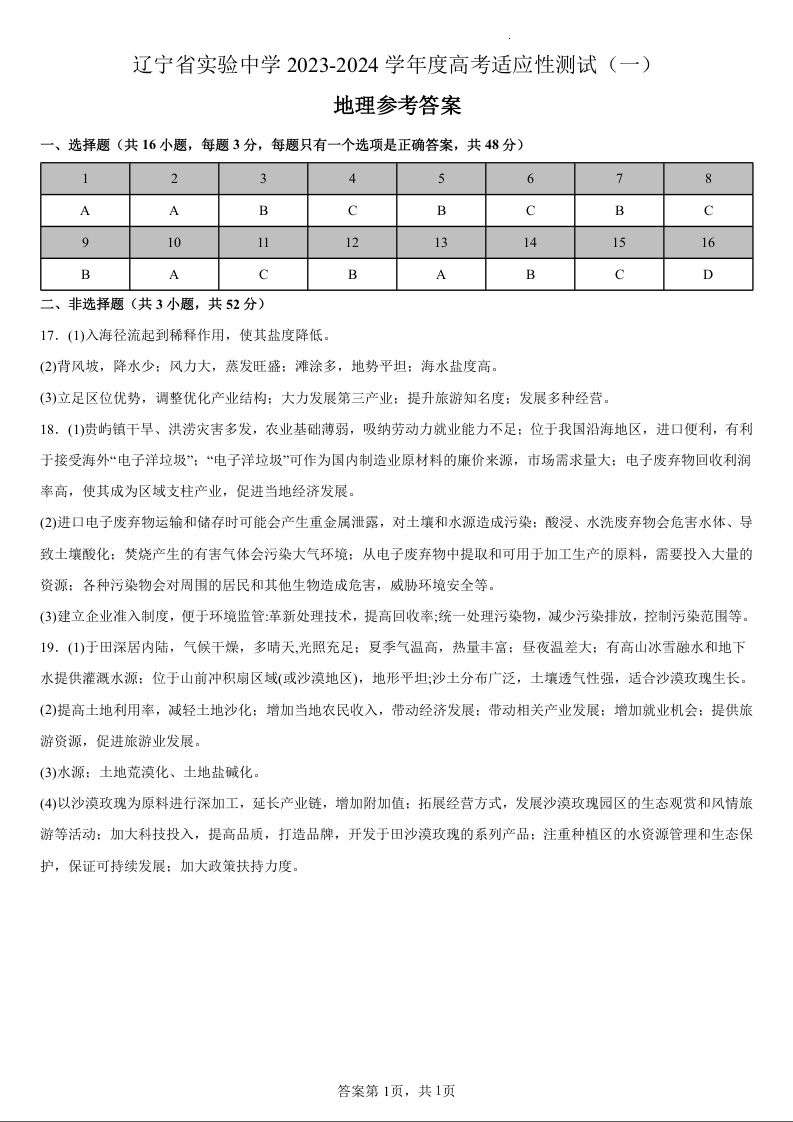 辽宁省实验中学2023-2024学年高三上学期高考适应性测试(一)地理参考答案