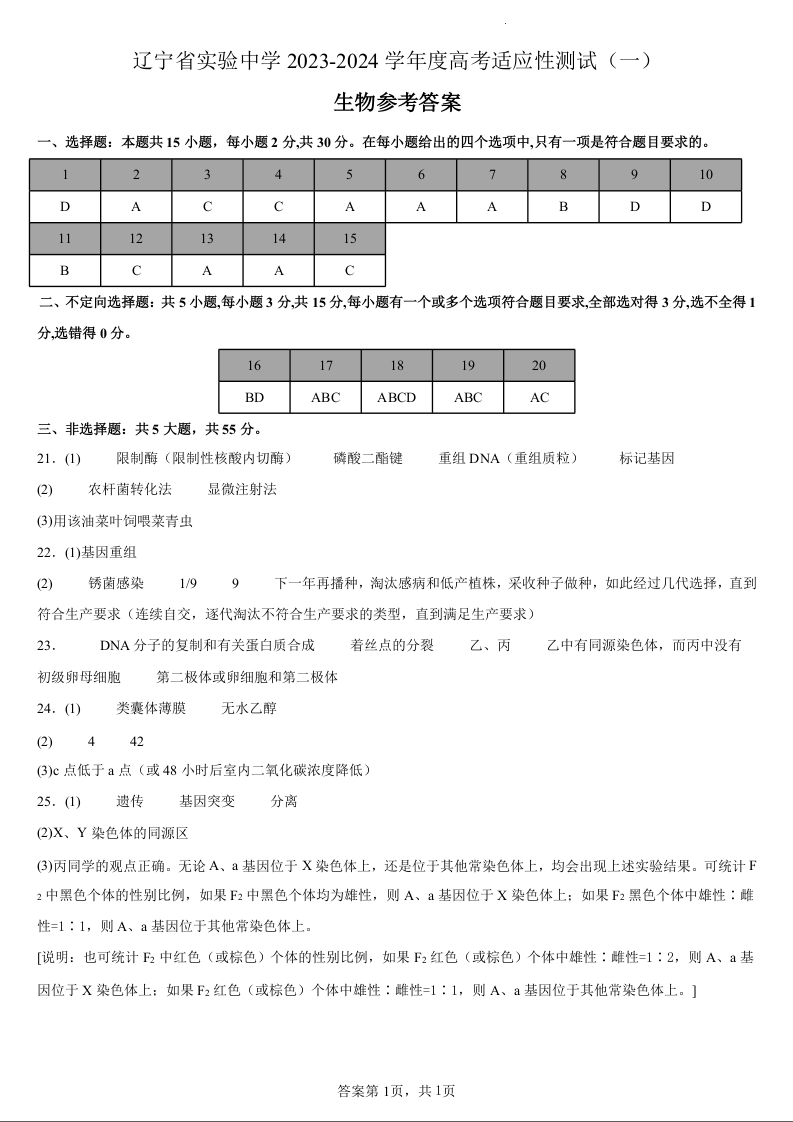 辽宁省实验中学2023-2024学年高三上学期高考适应性测试(一)生物参考答案