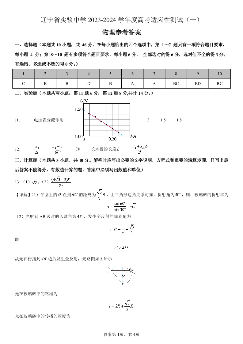 辽宁省实验中学2023-2024学年高三上学期高考适应性测试(一)物理参考答案
