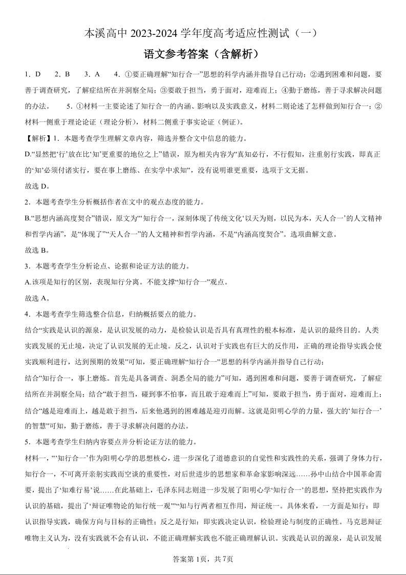 本溪高中2023-2024学年度高考适应性测试(一)语文参考答案