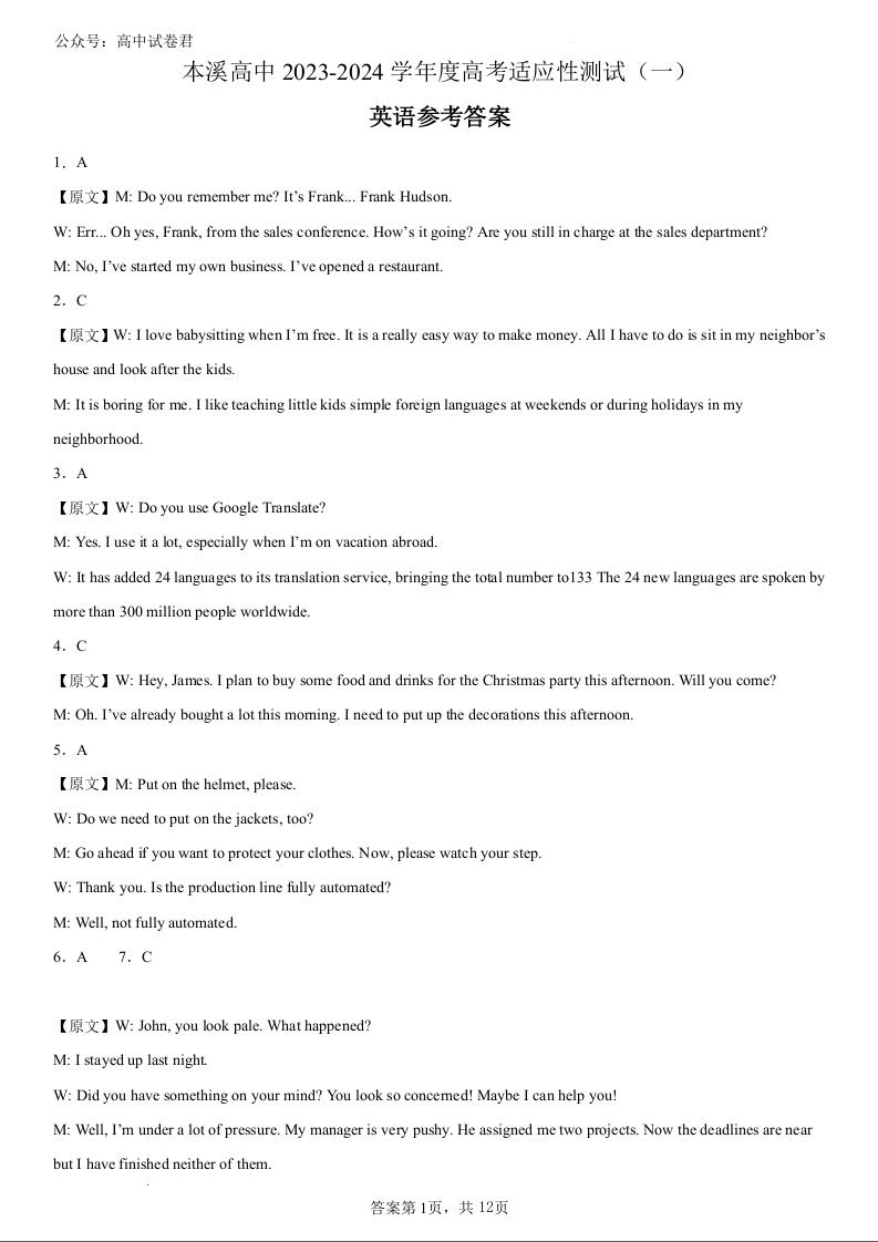 本溪高中2023-2024学年度高考适应性测试(一)英语参考答案
